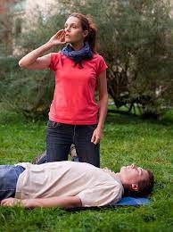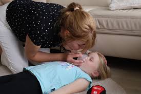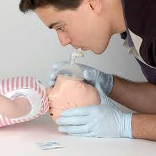Pinch the child’s nose while their head is tilted back, form a seal with your mouth over the child’s mouth, force the first breath in, looking at the chest look for the rise and fall once you have established the air is going in give a further 4 breaths steady, release the nose between each breath.
