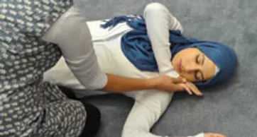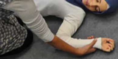 Lift the casualty’s hand closest to you and let it drop lightly and naturally beside their head. Do not force the hand down, as this may cause injury.