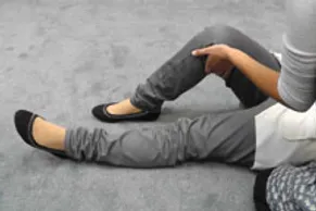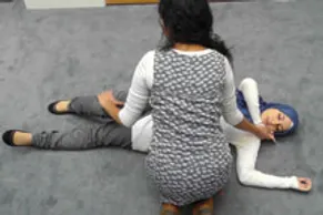 Pick up the child’s leg, furthest away from you, with your hand under the knee, the foot should remain flat on the floor, bring legs closer this allows easy rolling of the child, your hand should remain on the child knee to prevent it from dropping.